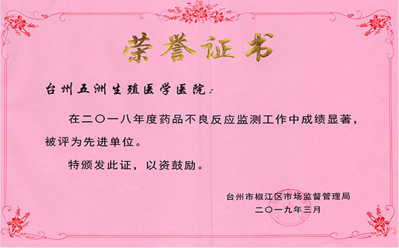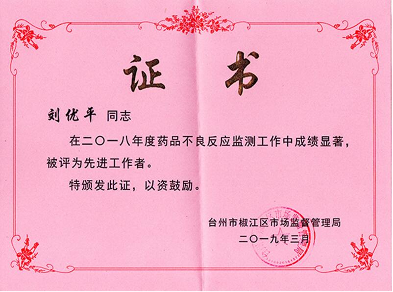 2018年度椒江区药品和医疗器械不良反应监测工作圆满完成,为鼓励先进,进一步推进全区药品和医疗器械不良事件监测工作,台州市椒江区市场监督管理局下发《关于表彰2018年度椒江区药品不良反应和医疗器械不良事件监测工作先进单位和个人的通报》,我院被表彰为“药品不良反应监测工作先进集体”,我院监测员刘优平被表彰为“药品不良反应监测工作先进个人”。